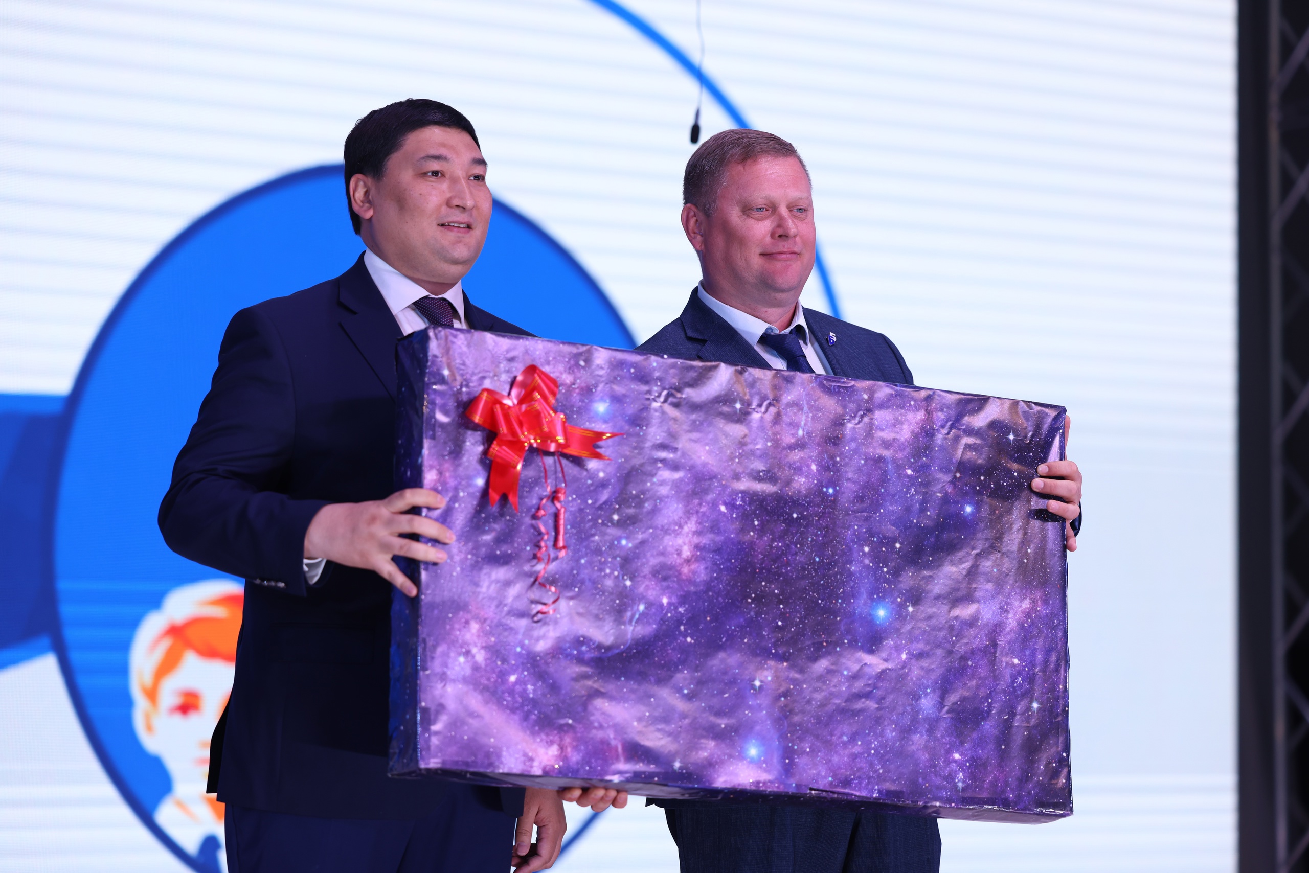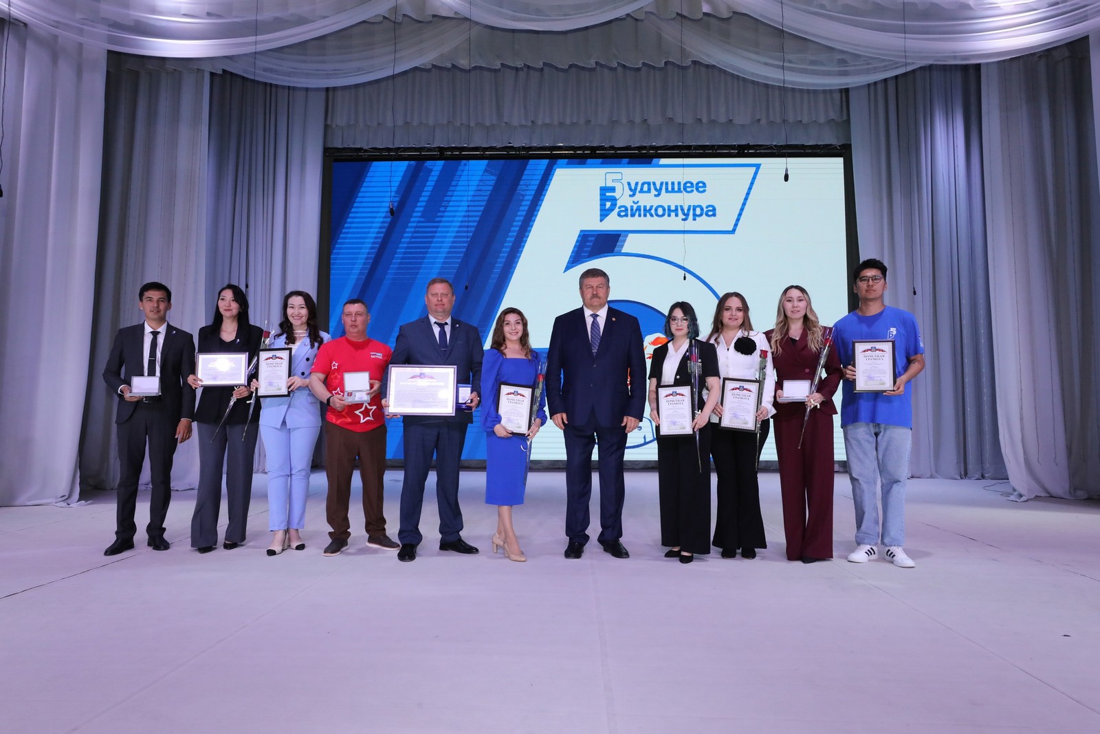 Празднование продолжилось в киноконцертном зале «Сатурн» имени Карена Шахназарова. Торжественное собрание было открыто исполнением гимнов Российской Федерации и Республики Казахстан, что подчеркнуло международный характер движения. Выступая перед участниками, глава администрации города Константин Бусыгин отметил, что за пять лет «Будущее Байконура» стало неотъемлемой частью жизни города. Он подчеркнул уникальность движения и его вклад в воспитание патриотов и лидеров будущего. За высокий профессионализм, активное участие в духовно-нравственном воспитании молодого поколения и в честь 5-летия со дня образования Городского движения детей и молодежи «Будущее Байконура» Константин Бусыгин наградил настольной медалью «Гагарин» директора ГБУ ГДК Асем Ким и директора ГБУ ДО «ЦРТДиЮ им. В.М. Комарова» Ирину Кузьмину.