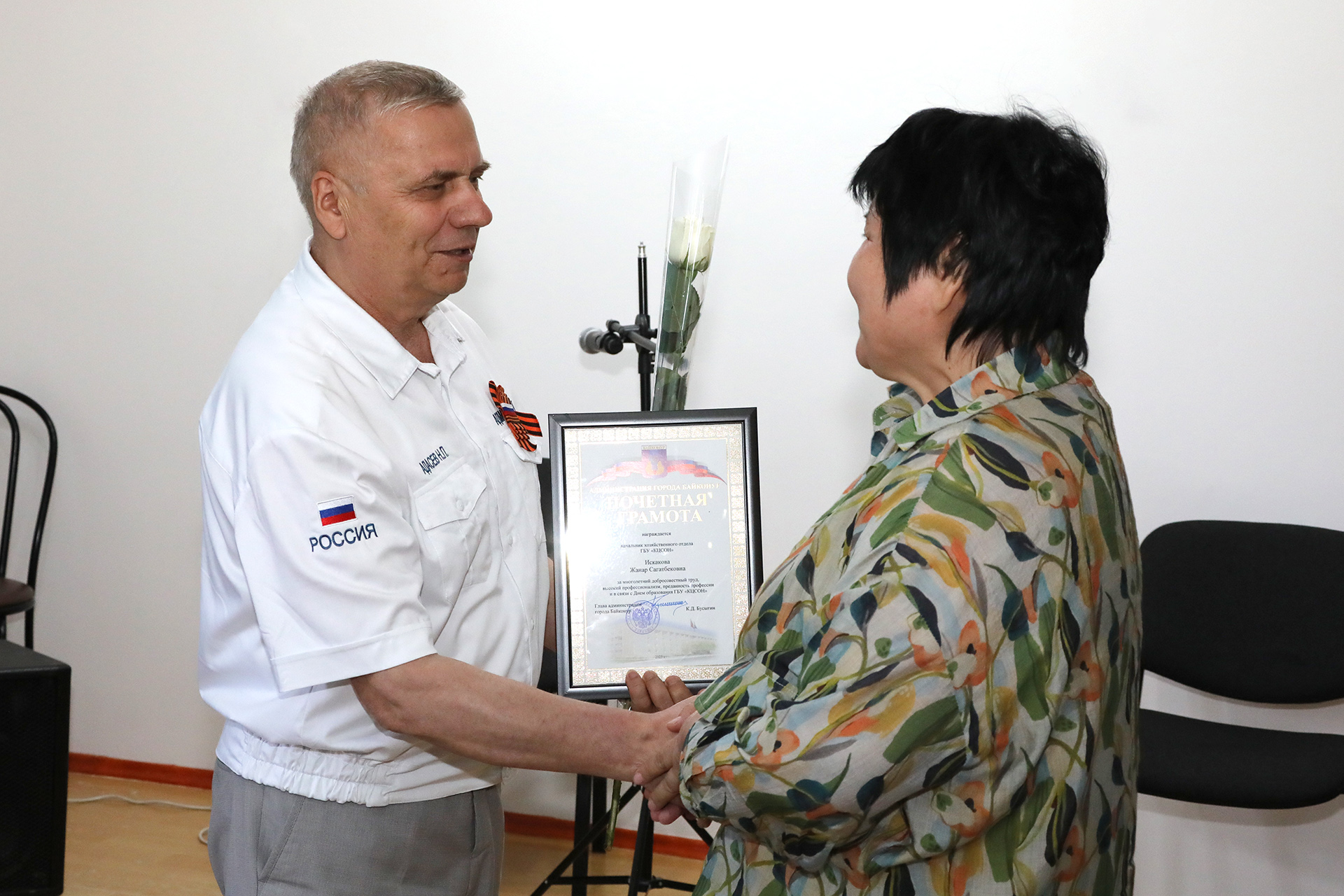 Поздравить сотрудников центра прибыл заместитель главы администрации города Николай Адасёв. Он выразил признательность коллективу за самоотверженный труд, чуткость и преданность делу помощи людям. Главой администрации города руководители и сотрудники учреждения были удостоены наград, которые им вручил Николай Адасев. За высокий профессионализм и выдающиеся лидерские качества директор ГБУ «КЦСОН» Елена Ребрун награждена настольной медалью «Байконур». Вручая благодарственное письмо главы администрации коллективу учреждения, Николай Адасев подчеркнул: «Вы всегда рядом в моменты, когда человек нуждается в поддержке или попал в сложную жизненную ситуацию». Почётными грамотами главы администрации города Байконура награждены Айнур Башарова и Жанар Искакова. Ценными подарками за профессиональные достижения отмечены Денис Сосин и Александр Фардеев. Благодарность главы администрации объявлена Ирине Кожолянко.