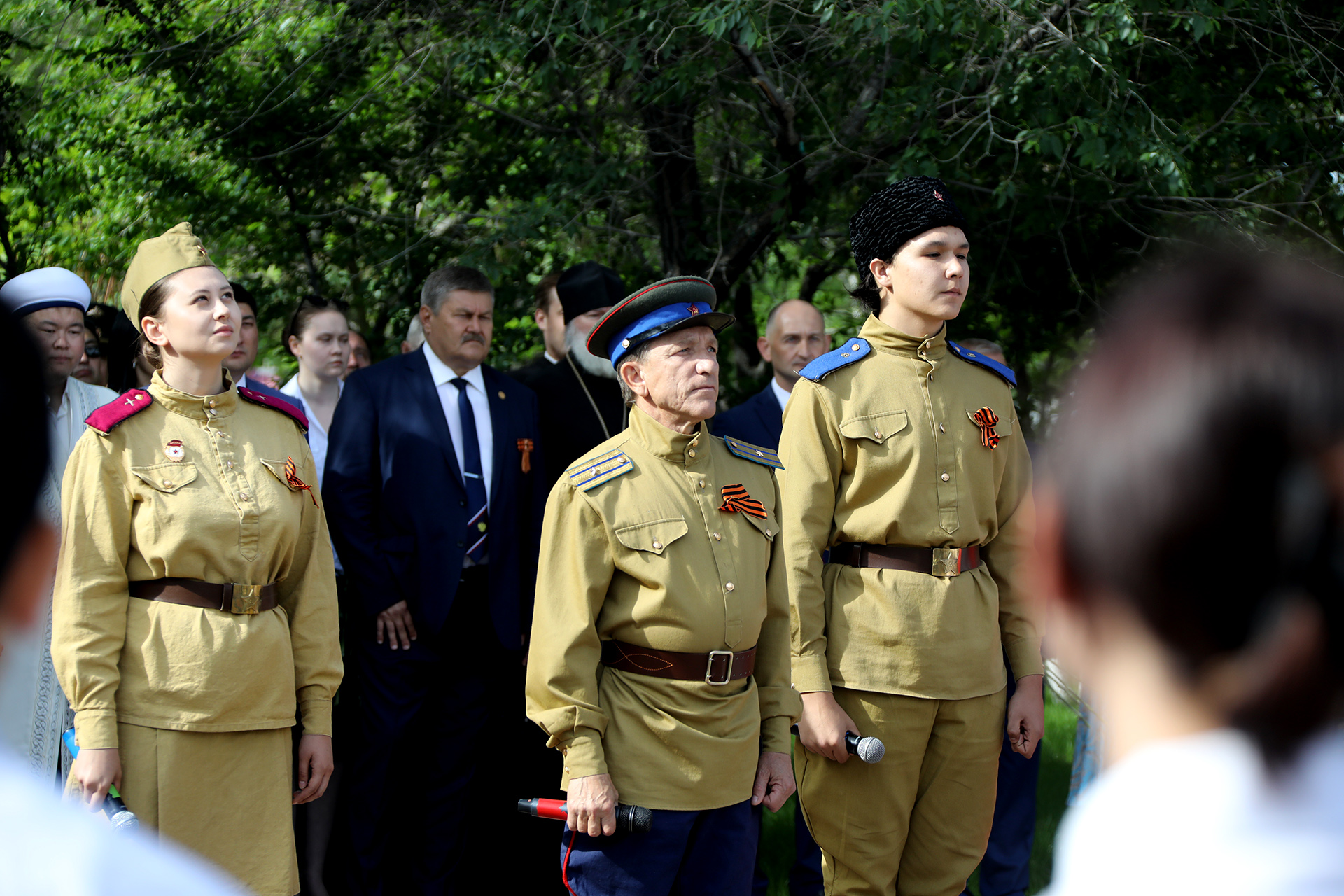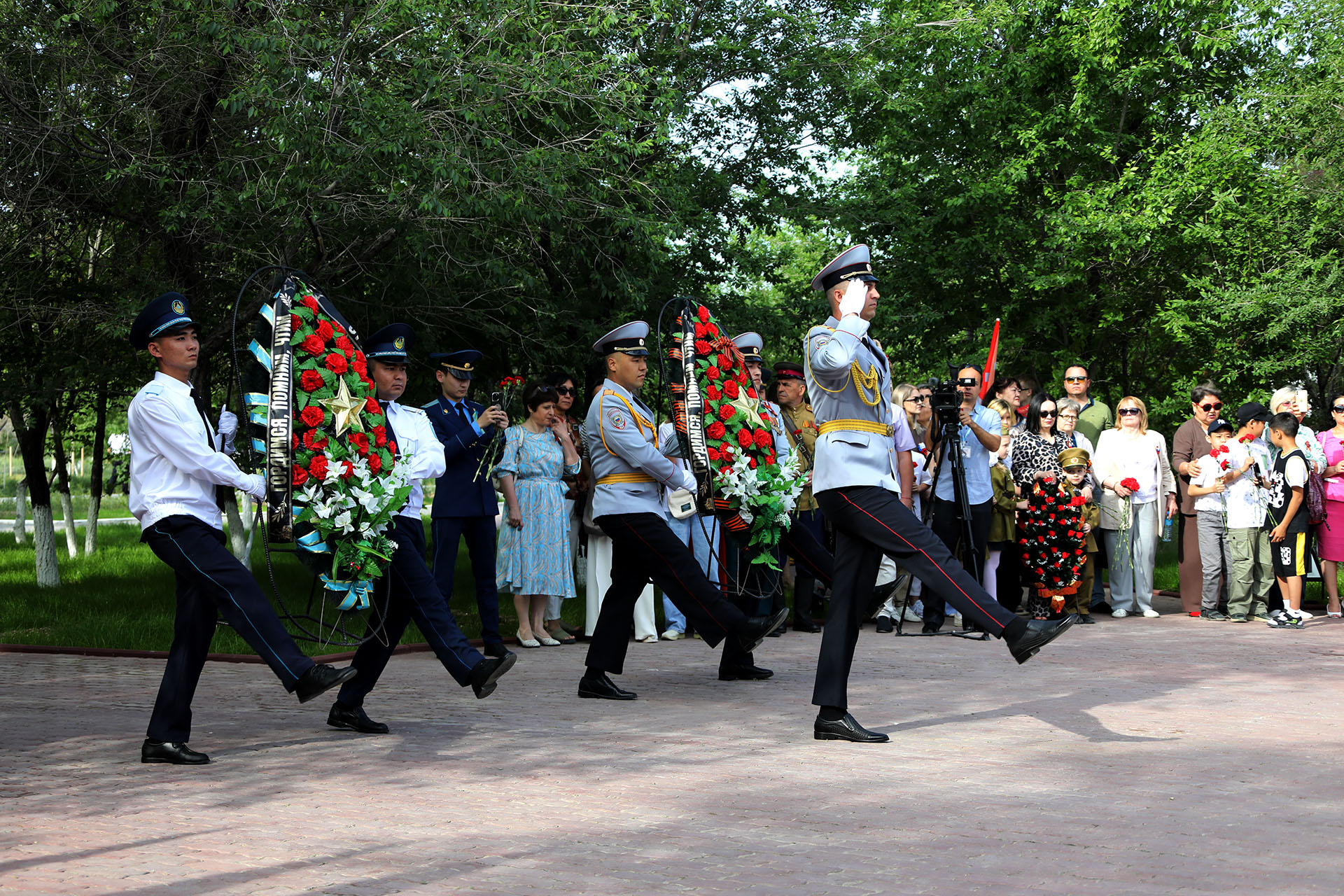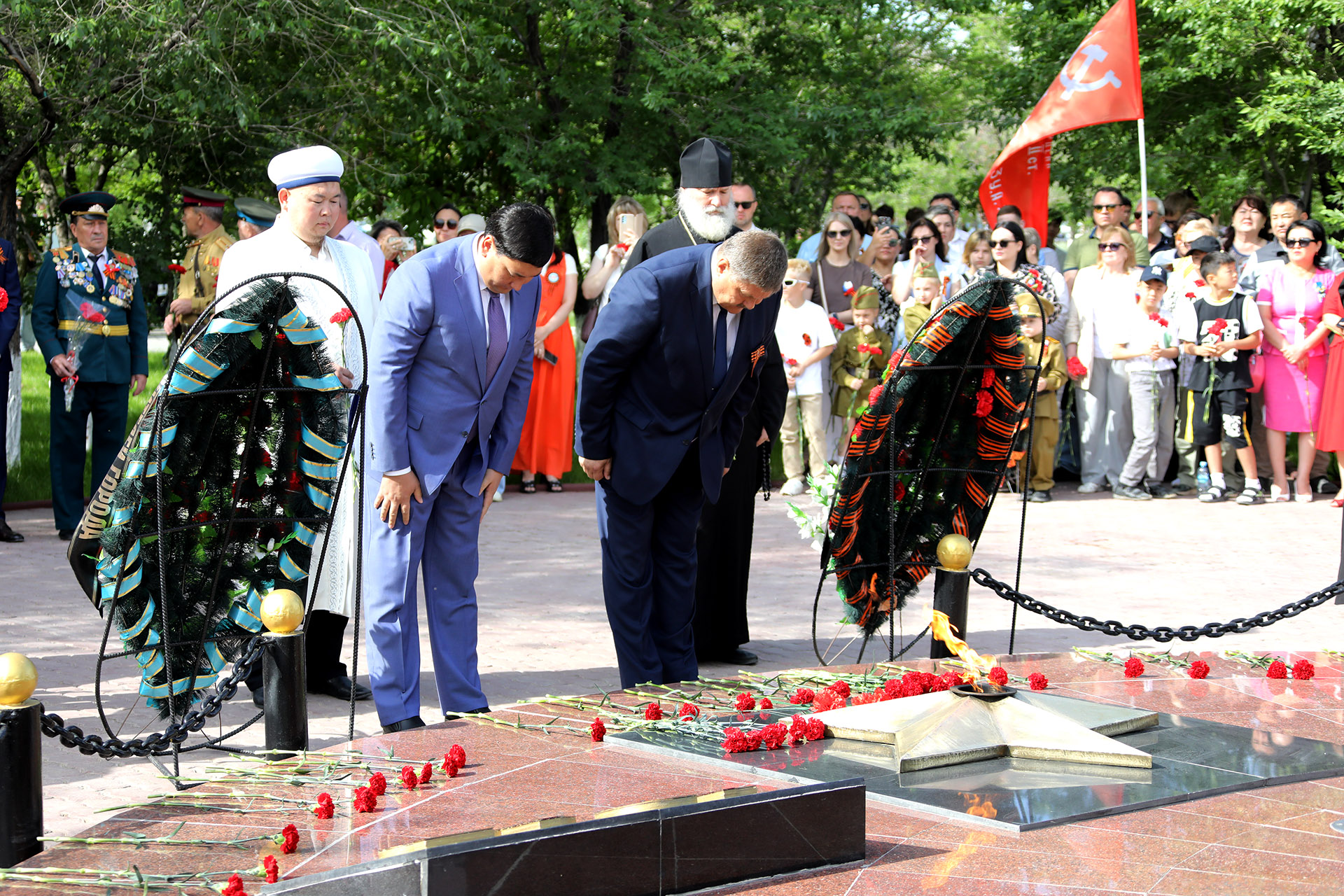 Настоятель храма Святого великомученика Георгия Победоносца отец Даниил отслужил торжественный молебен в память о погибших. Бас-имам центральной мечети «Жарымбет» Омиржан Тобжанов прочитал священные аяты из Корана, вознося молитвы за упокой душ павших воинов.