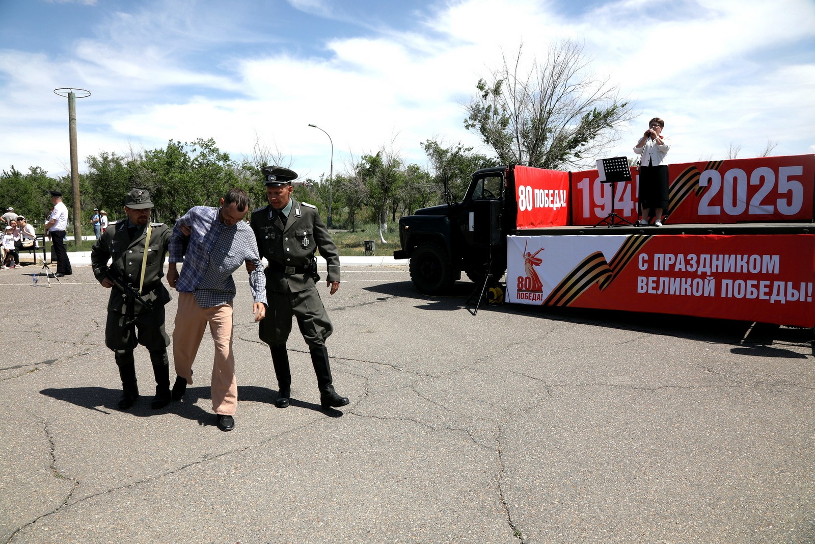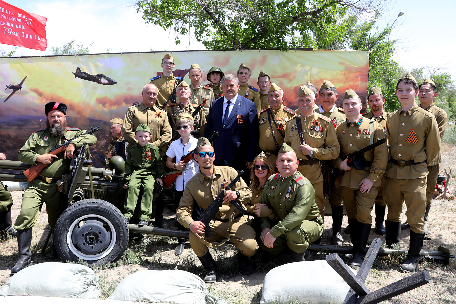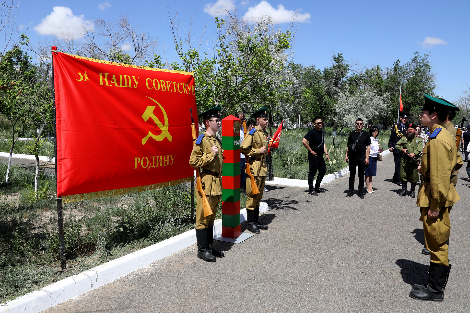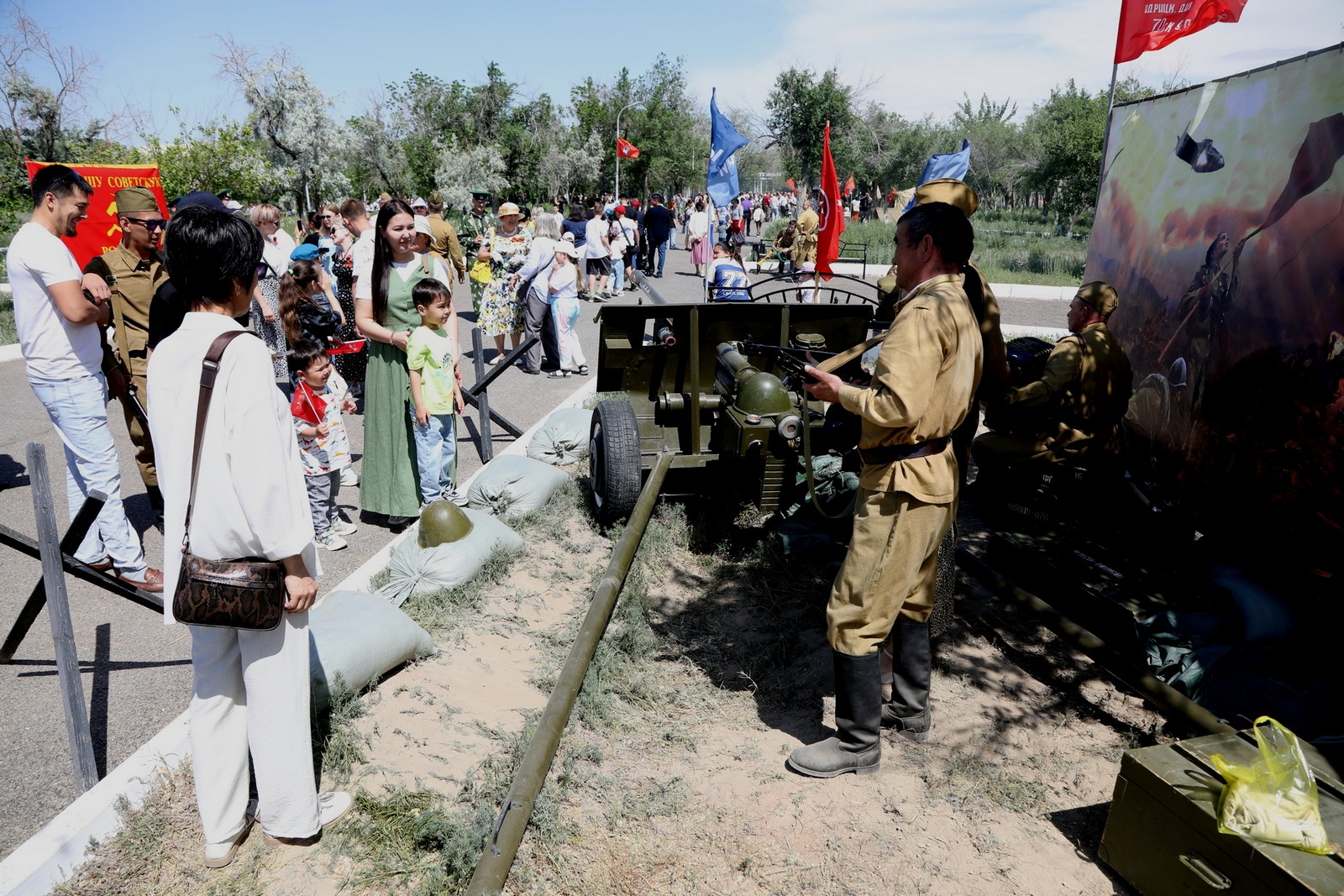 В парке были подготовлены военно-исторические экспозиции, в которых были представлены макеты оружия времён 1941–1945 годов, оборудован полевой лазарет. Байконурцы с интересом рассматривали экспонаты, фотографировались с оружием и активистами общественных организаций, одетыми в военную форму бойцов Красной армии.