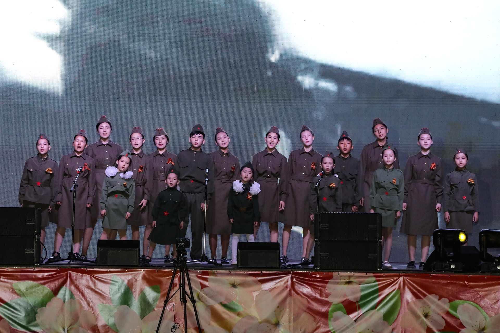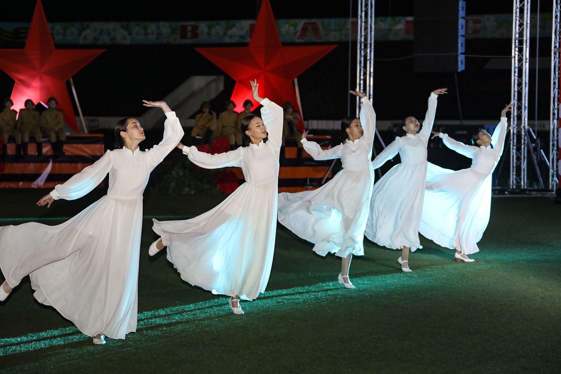 Концерт стал своеобразным хронологическим путешествием по страницам истории войны: от тревожных первых дней и прощаний на перронах – до победного мая 1945 года. Одна за другой на стадионе сменялись сцены: проводы на фронт, мужество бойцов в бою, стойкость тружеников тыла, подвиг женщин и детей в годы войны. Со сцены звучали песни о городах-героях – символах самоотверженности, мужества и непокорённого духа. Отдельный блок концертной программы напомнил о вкладе Казахстана в Победу: именно здесь производилось огромное количество боеприпасов, снабжение фронта велось бесперебойно, а казахстанские воины сражались на всех фронтах и проявили массовый героизм.