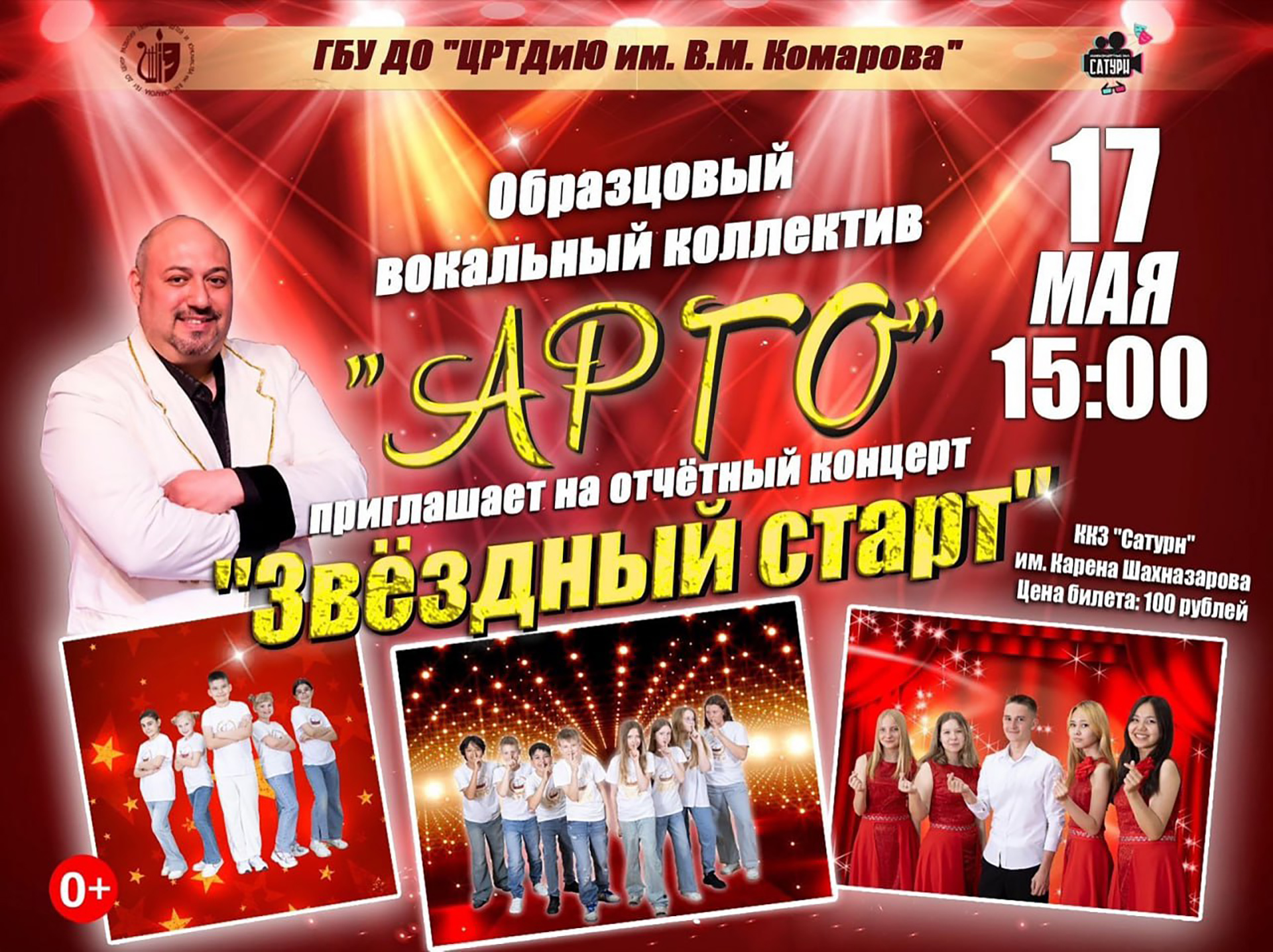 В 15:00 состоится отчетная концертная программа вокального коллектива «Арго». Место проведения – киноконцертный зал «Сатурн» им. Карена Шахназарова.