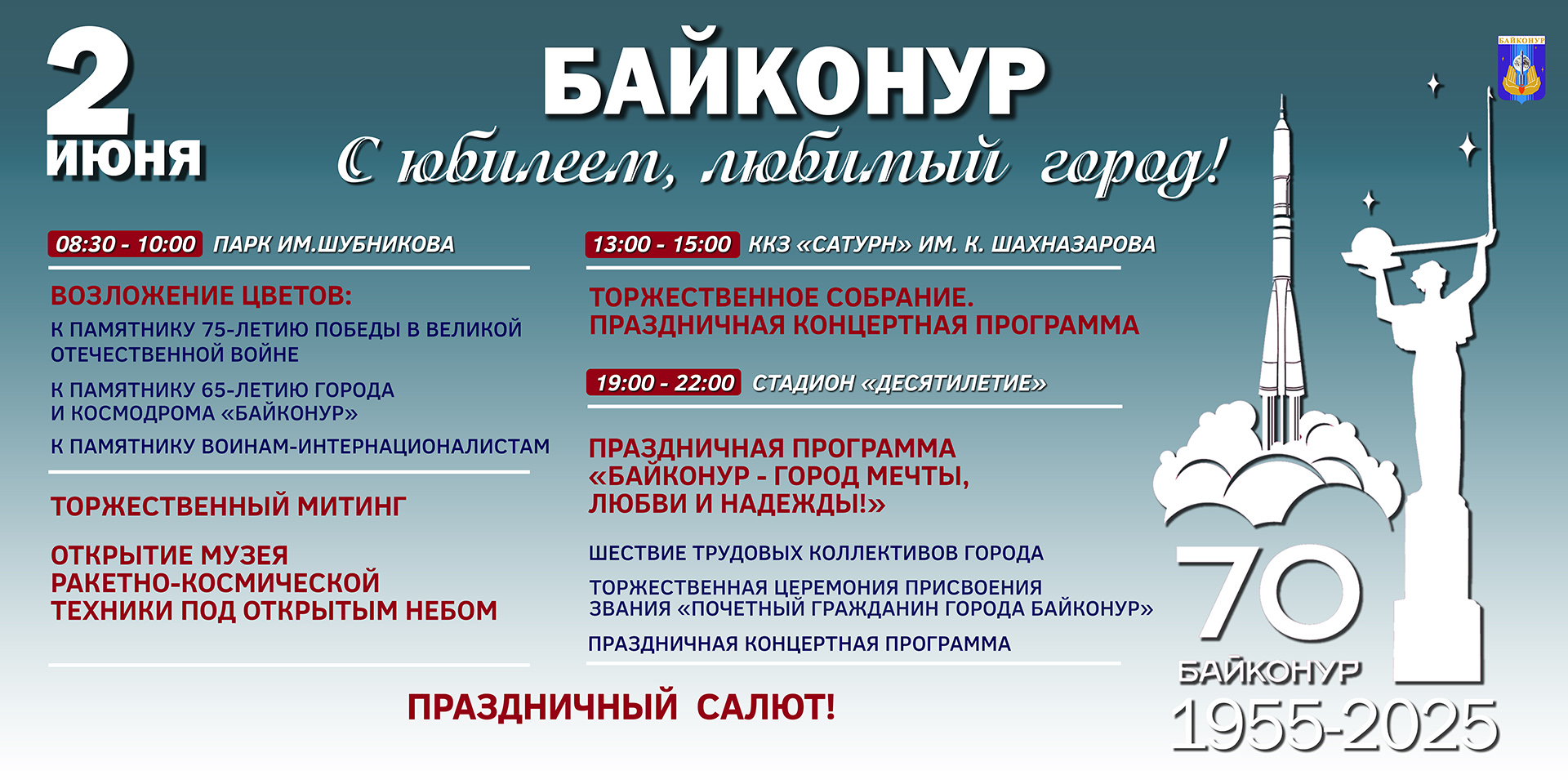В 19.00 на стадионе «Десятилетие» начнётся праздничная программа «Байконур – город мечты, любви и надежды». Зрители смогут увидеть театрализованное шествие «Мы – Байконурцы!», выступление официальных лиц, торжественную церемонию присвоения звания «Почетный гражданин города» и театрализованный концерт.