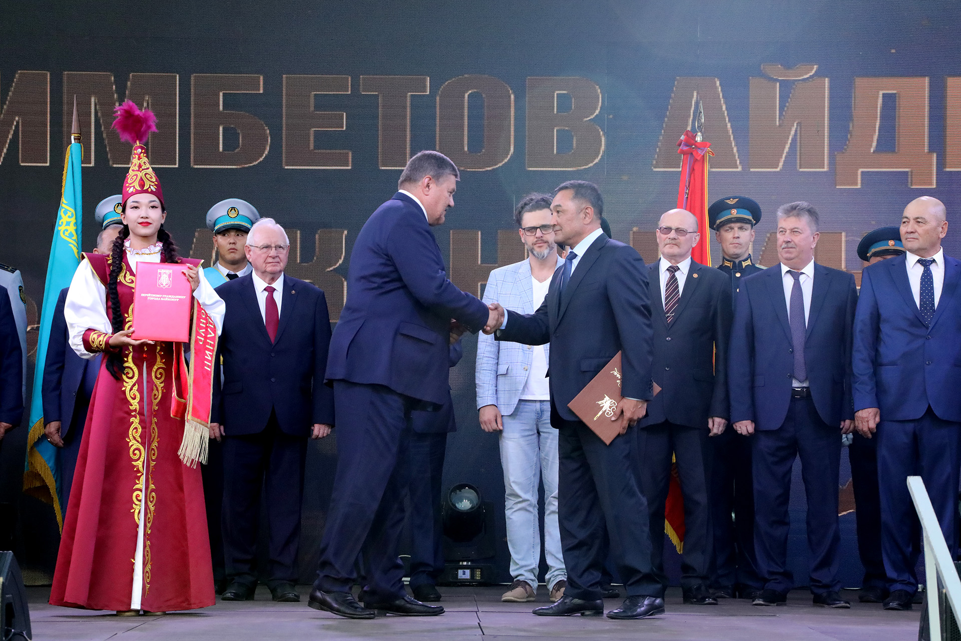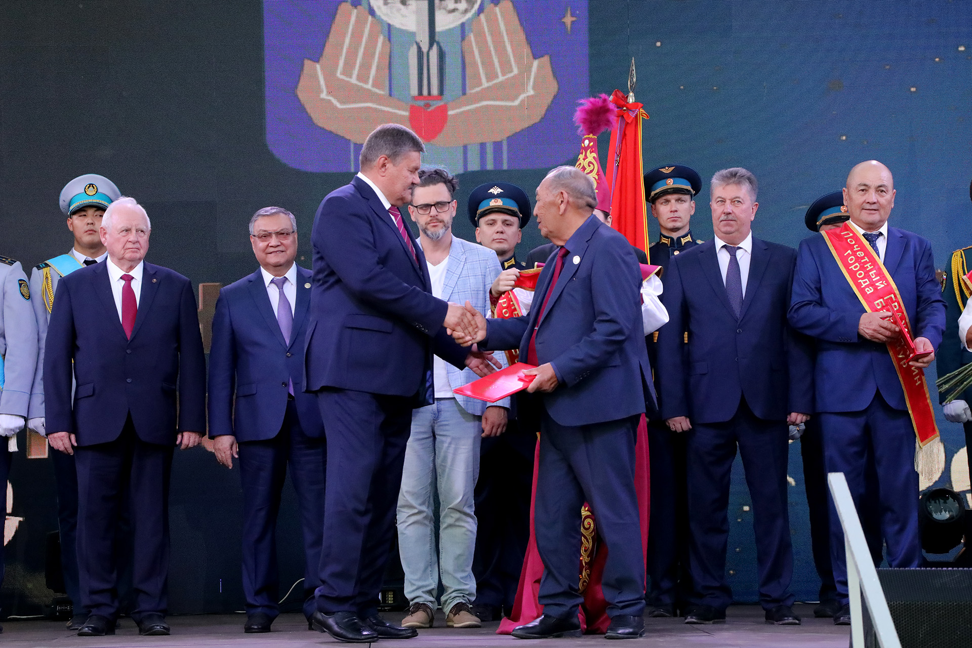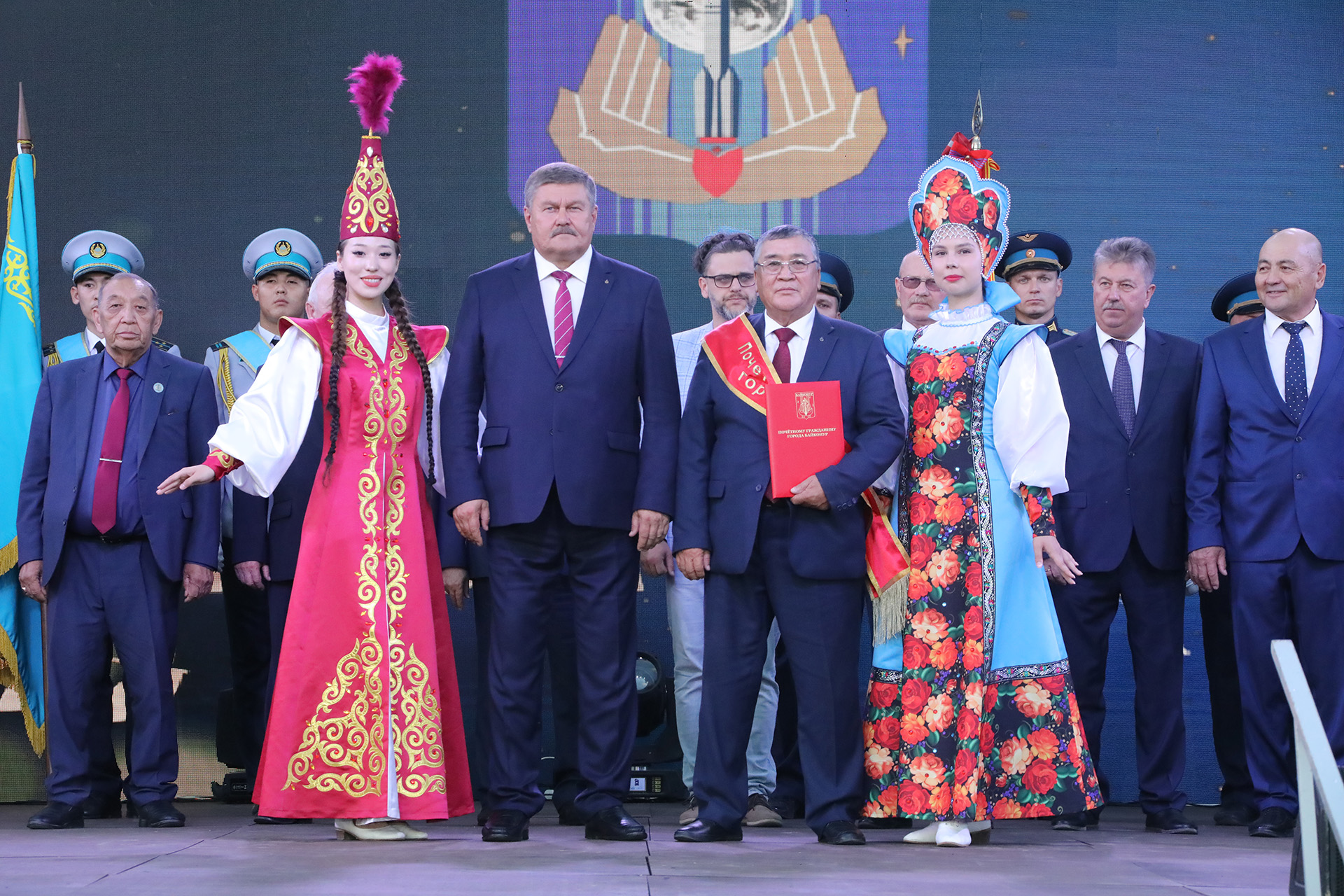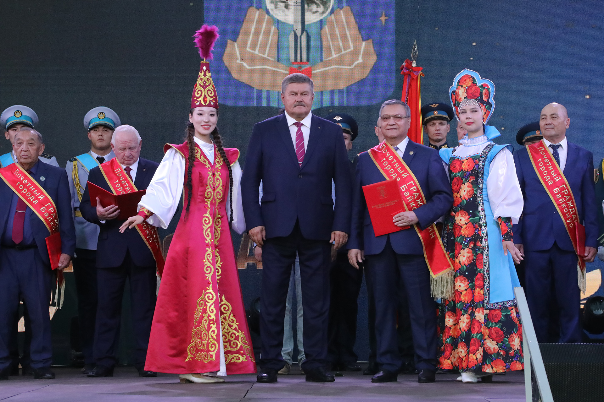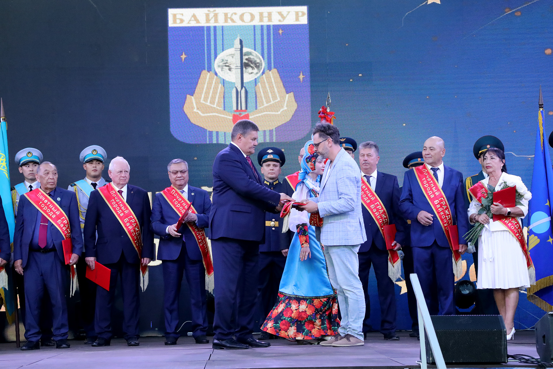 Каждому из вновь удостоенных почётного звания были вручены регалии почётного гражданина – удостоверение, именной адрес и нагрудная лента. Церемония сопровождалась продолжительными аплодисментами, в которых звучали признание и благодарность за вклад в развитие Байконура.