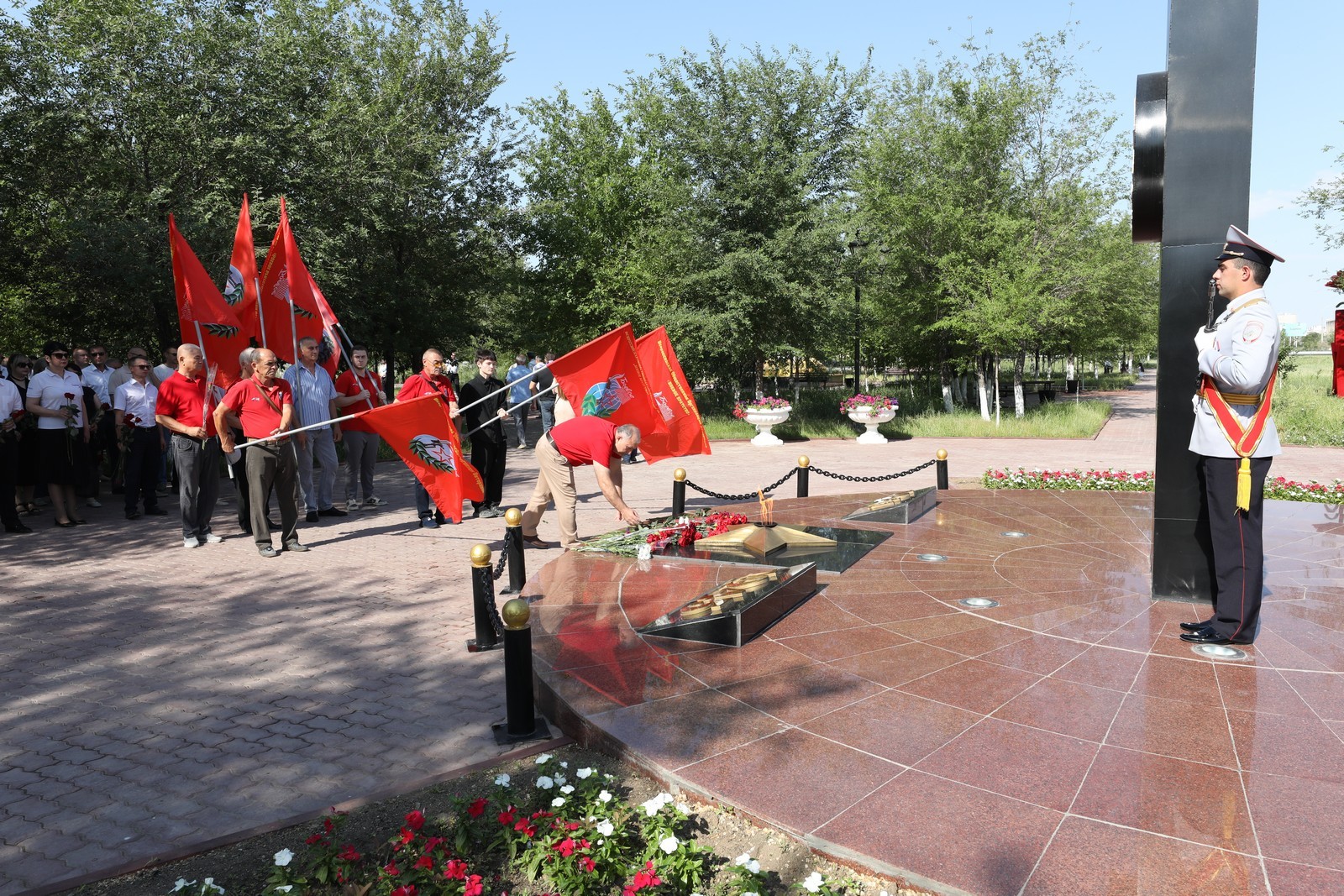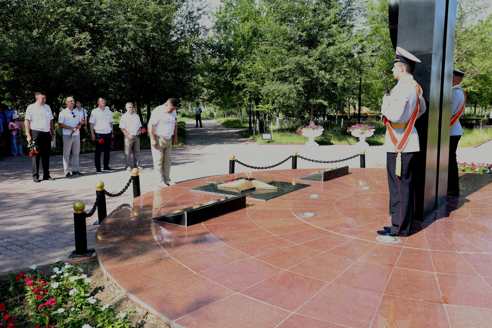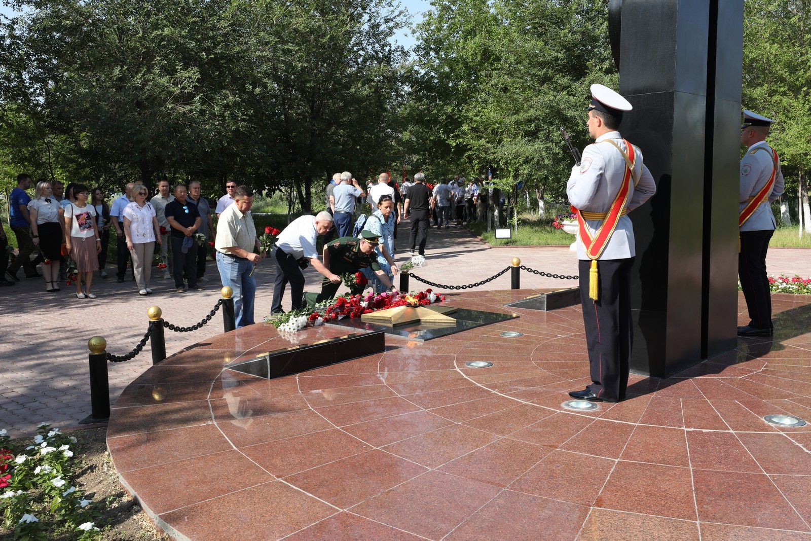 В скорбном молчании собравшиеся проходили к вечному огню, - символу нашей общей памяти о тех жертвах, которые наш народ принёс во имя Победы, и возложили к нему цветы.