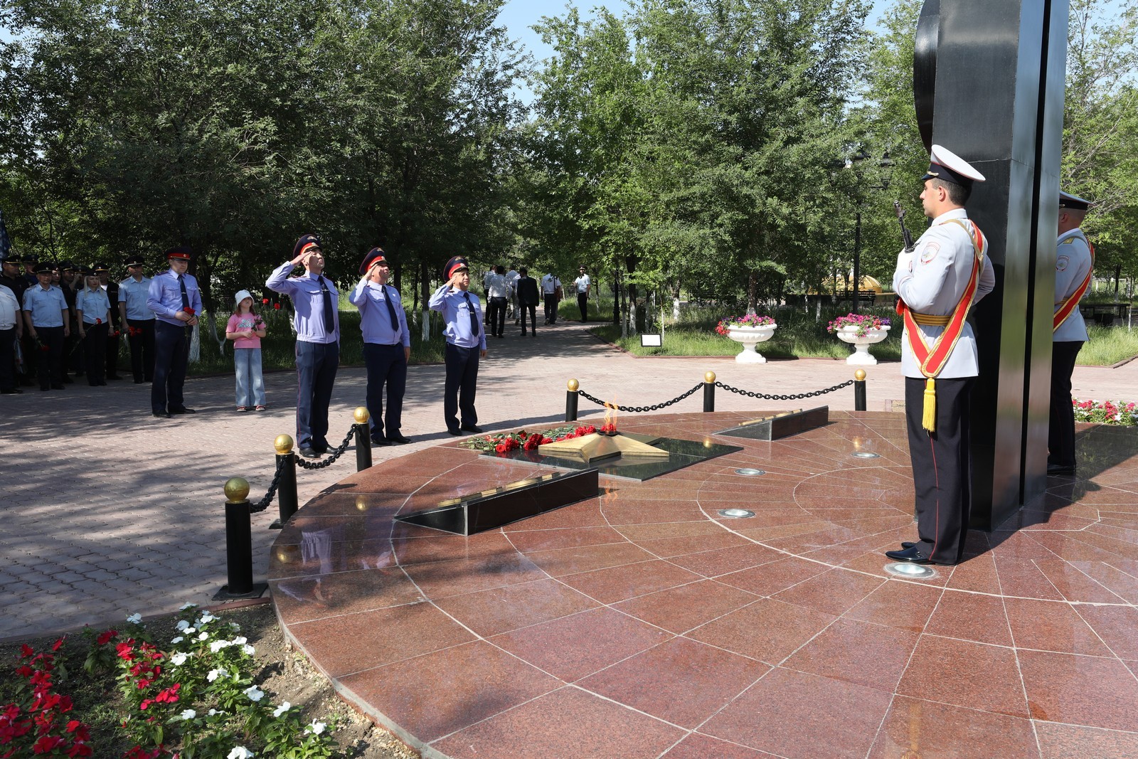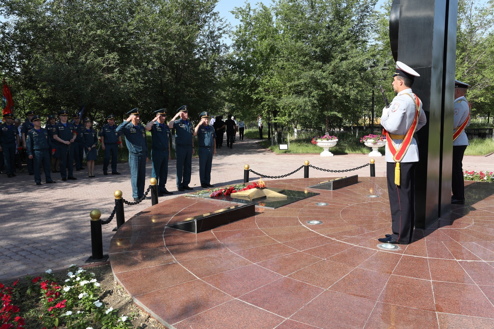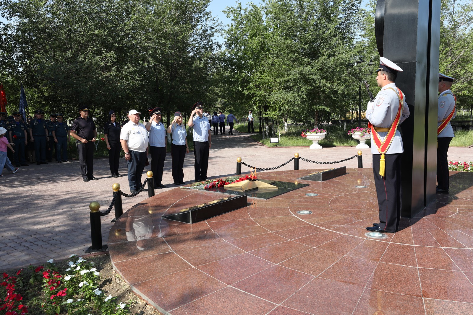 В скорбном молчании собравшиеся проходили к вечному огню, - символу нашей общей памяти о тех жертвах, которые наш народ принёс во имя Победы, и возложили к нему цветы.