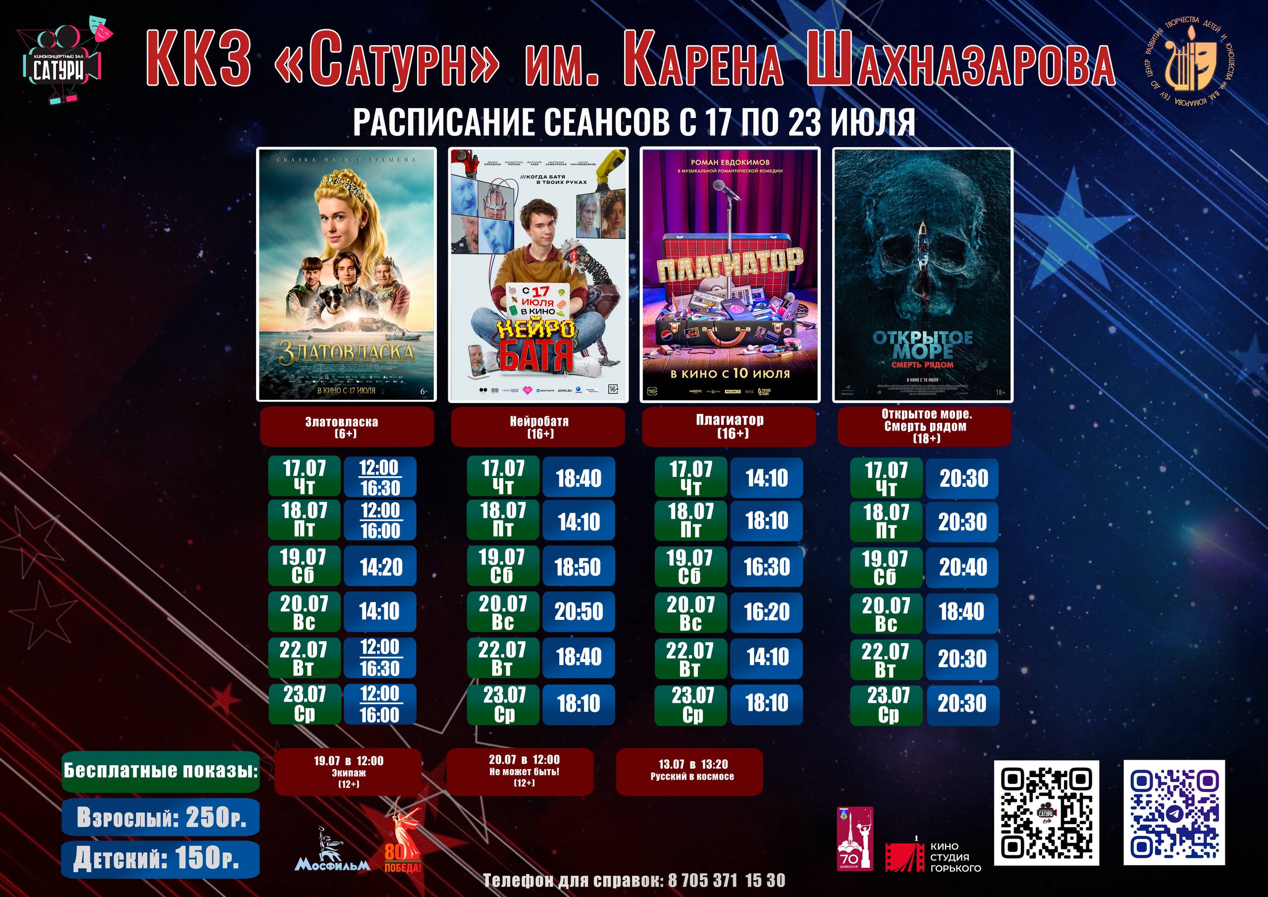 16.07.2025  Киноконцертный зал «Сатурн» приглашает жителей и гостей города на просмотр фильмов