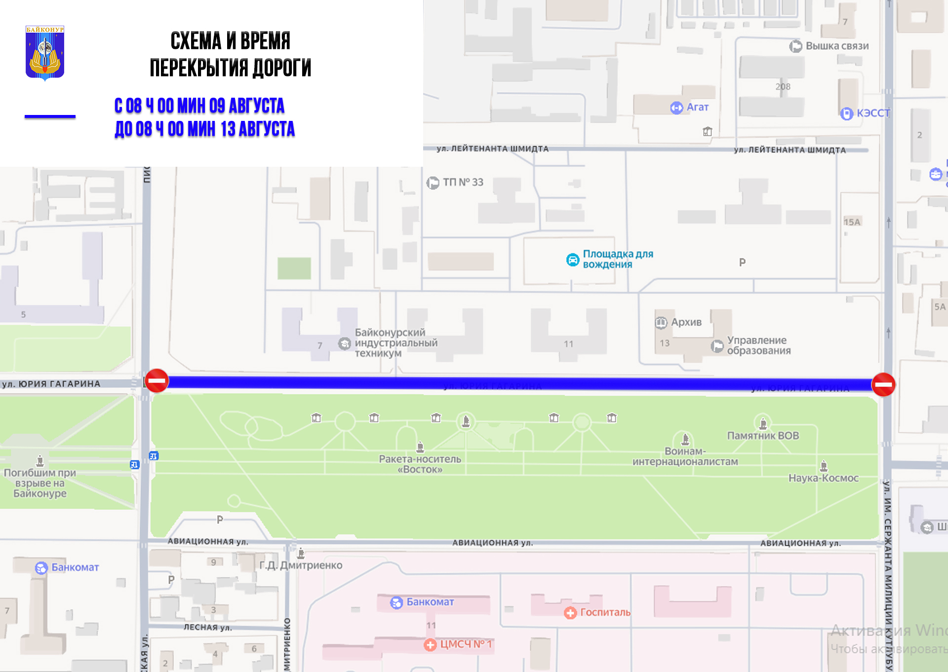 Уважаемые жители города Байконура. В связи с проведением работ по монтажу и демонтажу трубопровода с 08:00 9 августа до 08:00 13 августа будет ограничено движение транспортных средств на участке автомобильной дороги по улице Гагарина от пересечения с ул. Пионерской до пересечения с ул. Советской Армии.