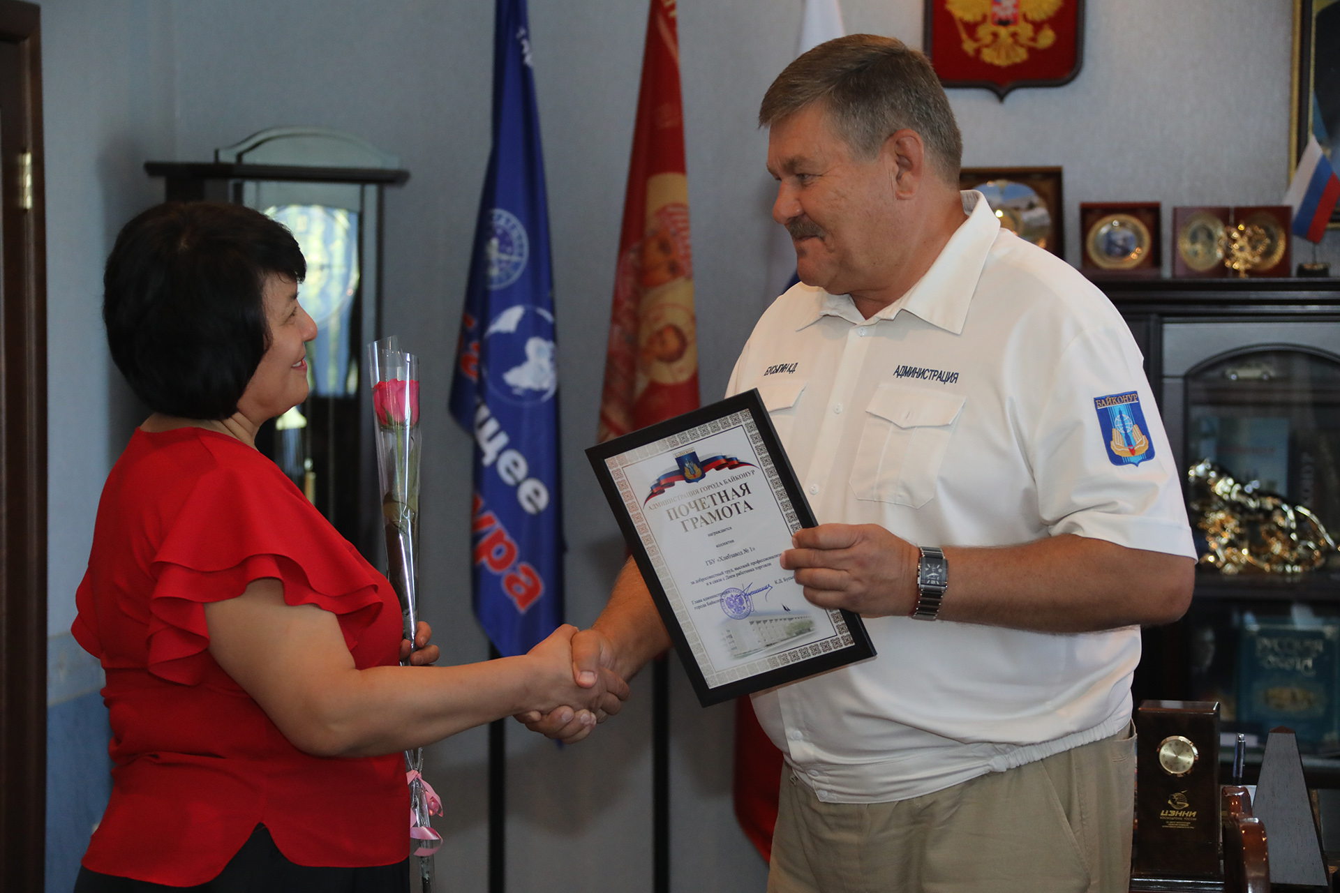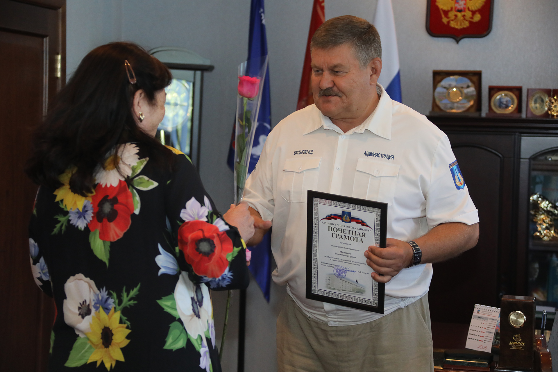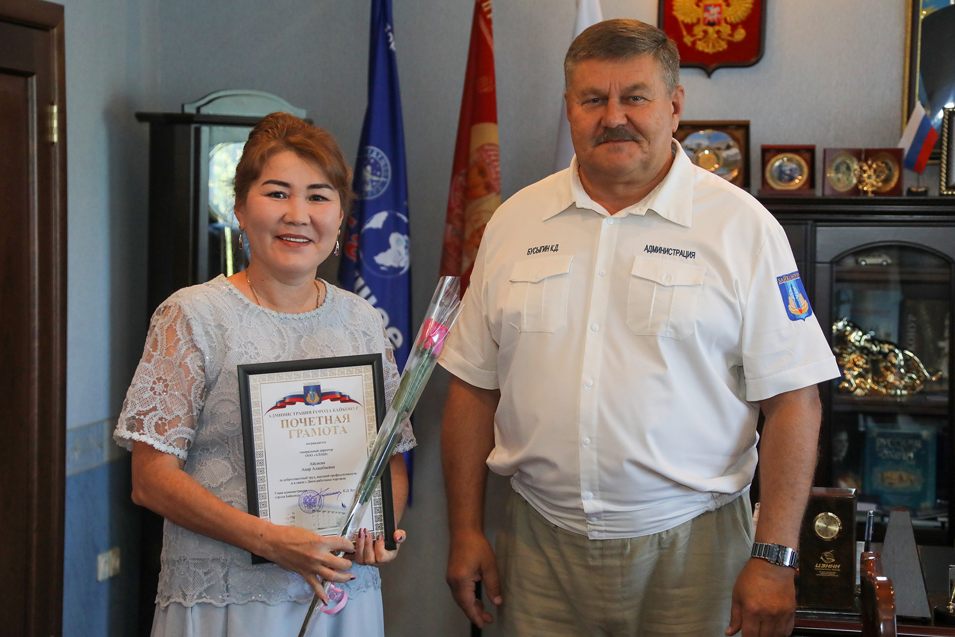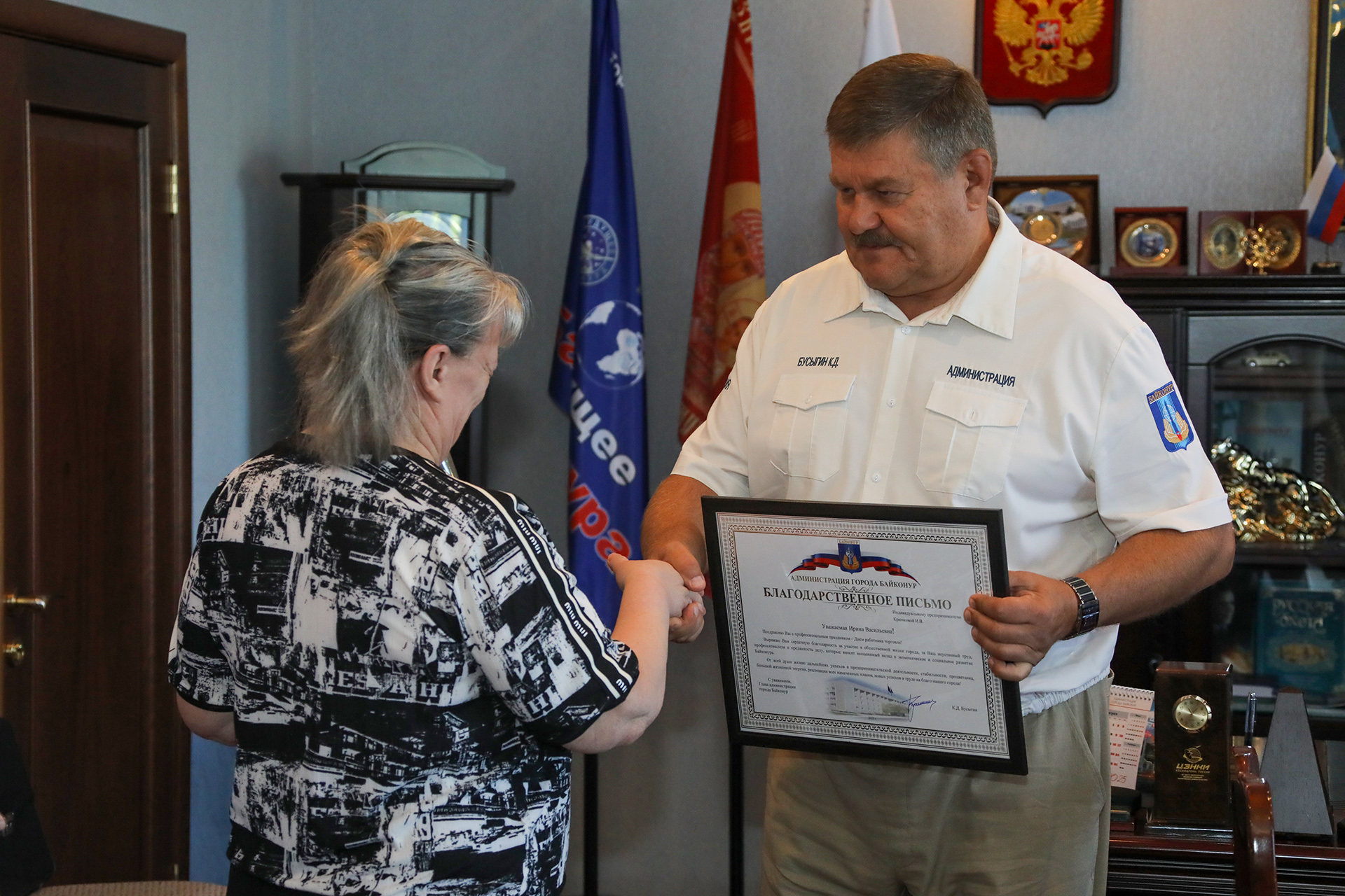 В ходе мероприятия Константин Бусыгин вручил почетные грамоты главы администрации, настольные медали «70 лет Байконуру» и благодарственные письма предпринимателям, внесшим особый вклад в развитие сферы торговли. Среди награжденных коллектив ГБУ «Хлебзавод № 1», генеральный директор ООО «АЛАШ», директора ООО «Бутя-Байконур» и ООО «Профи-Софт», а также индивидуальные предприниматели Гулсум Жаксылыкова, Сейл Жумадьяров, Ирина Крючкова, Гулбану Кутышова, Алия Жолдыбаева, Роза Мадьярова, Ирина Тимченко.