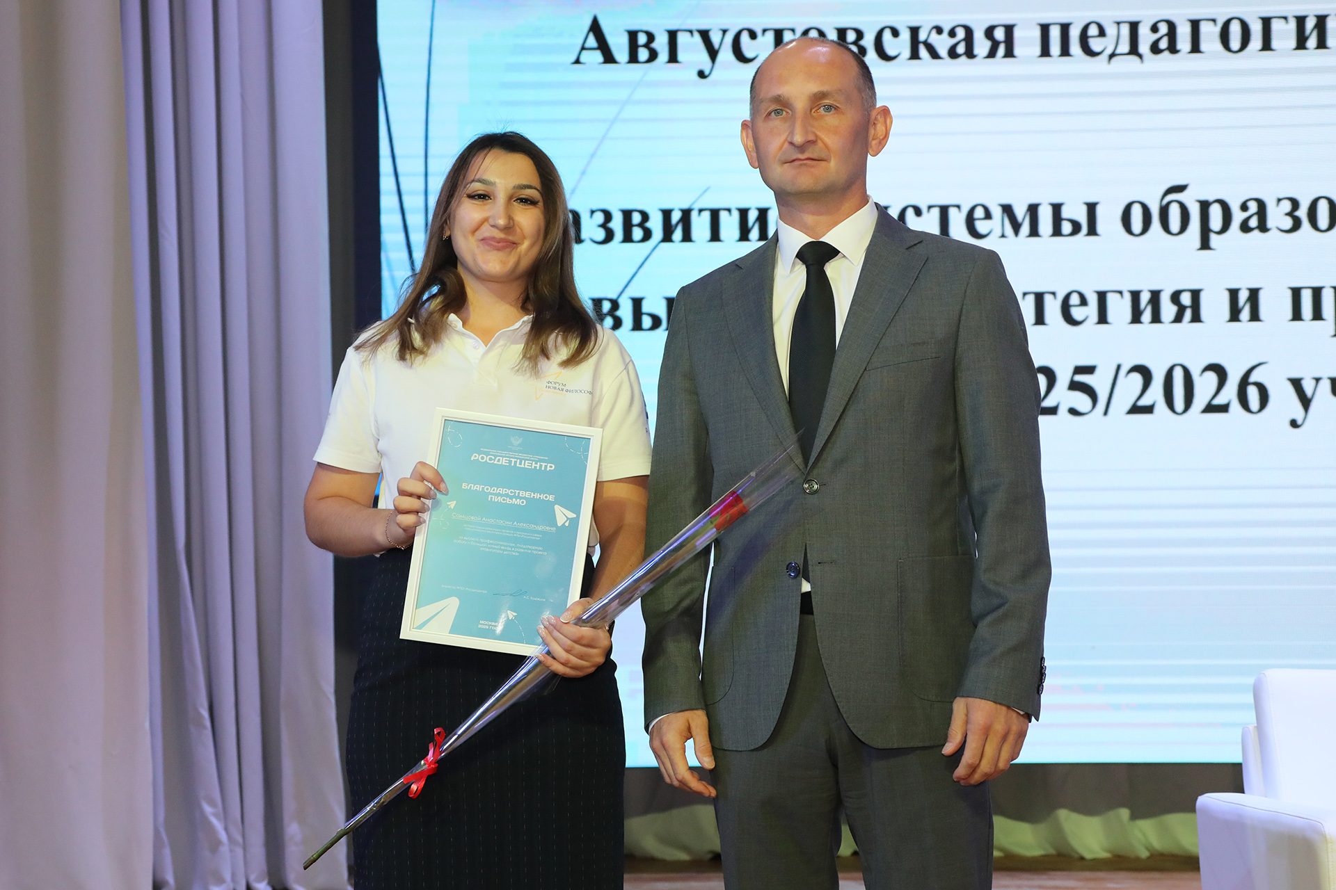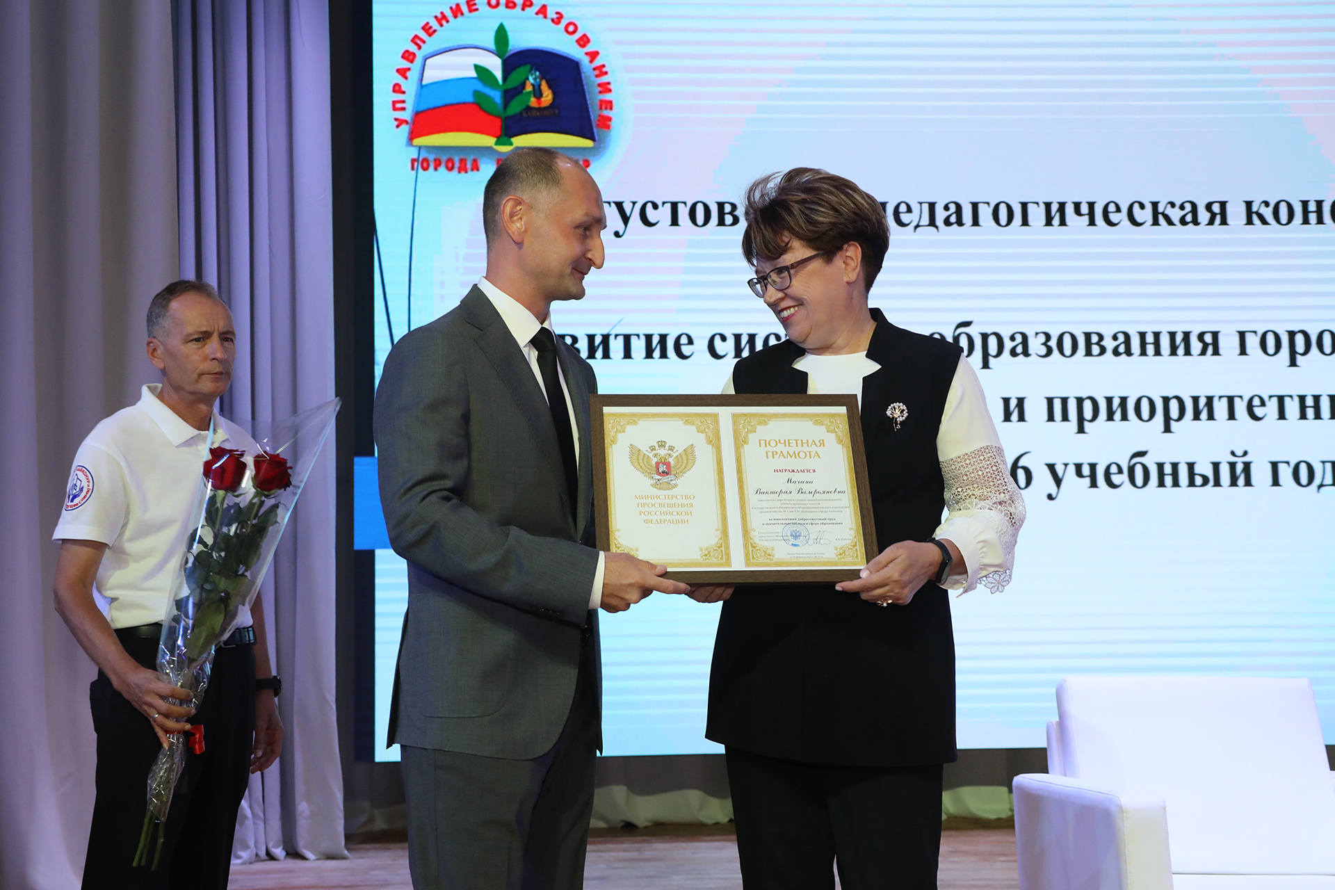 С тёплыми поздравлениями Тимур Вербицкий вручил ведомственные награды: благодарности Росдетцентра начальнику Управления образованием Елене Ким, советнику по воспитанию и взаимодействию с детскими общественными объединениями средней школы № 4 им. В.П. Глушко Анастасии Самцовой; почетную грамоту Минпросвещения России заместителю директора средней школы № 1 им. Г.М. Шубникова Виктории Мачиной.