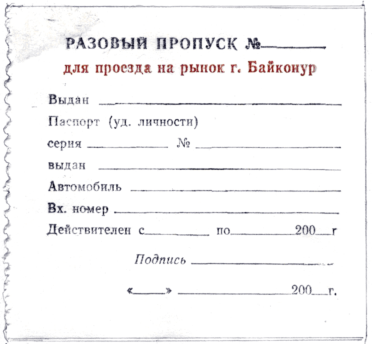 На бланке специального пропуска на белом фоне нанесена информация шрифтом черного цвета. Под наименованием специального пропуска «РАЗОВЫЙ ПРОПУСК № ____» шрифтом коричневого цвета по всей ширине бланка расположена фраза «для проезда на рынок г. Байконур».