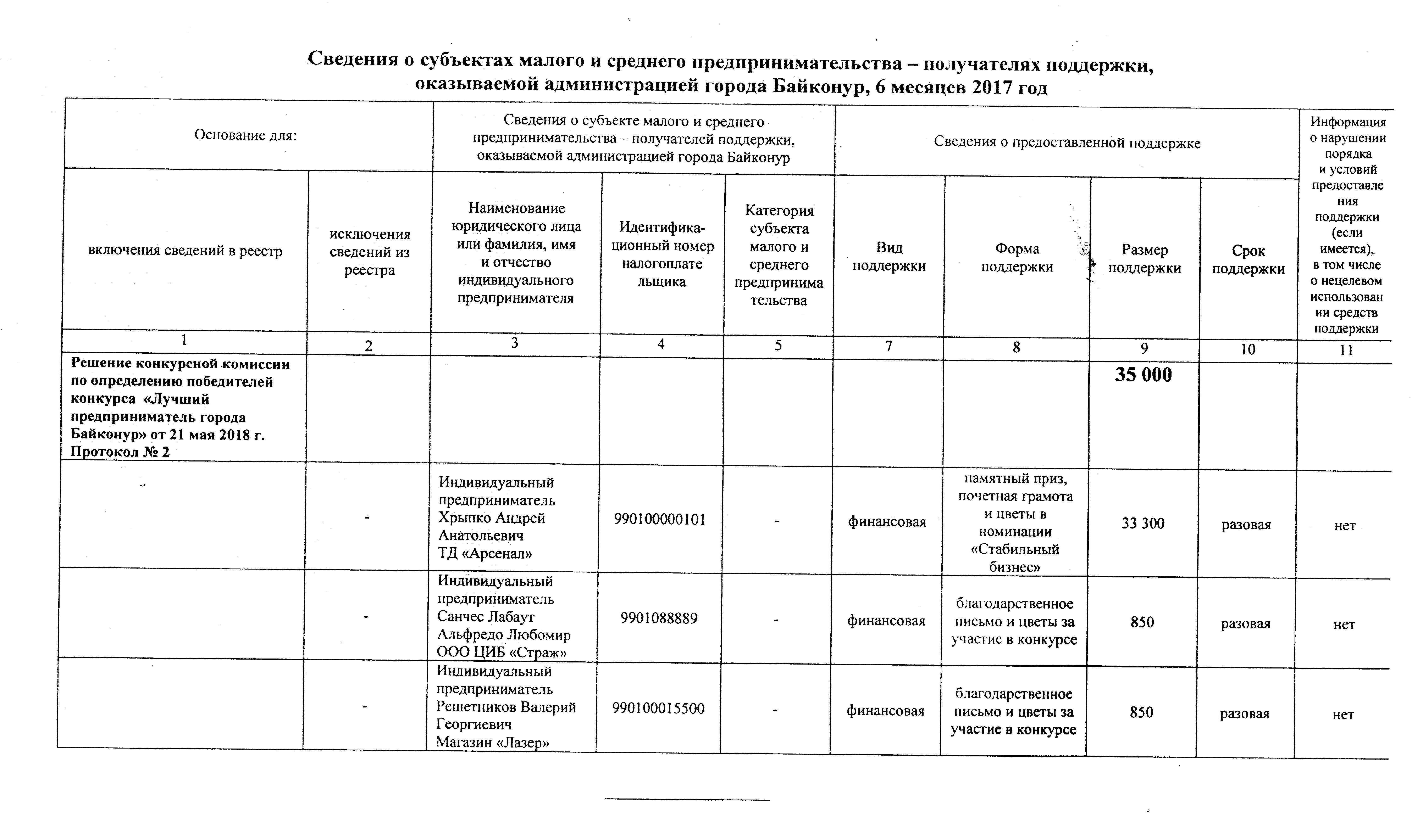 Реестр субъектов малого и среднего предпринимательства – получателей поддержки, оказываемой администрацией города Байконур за 1 полугодие 2017 г. ( скачать, просмотреть).