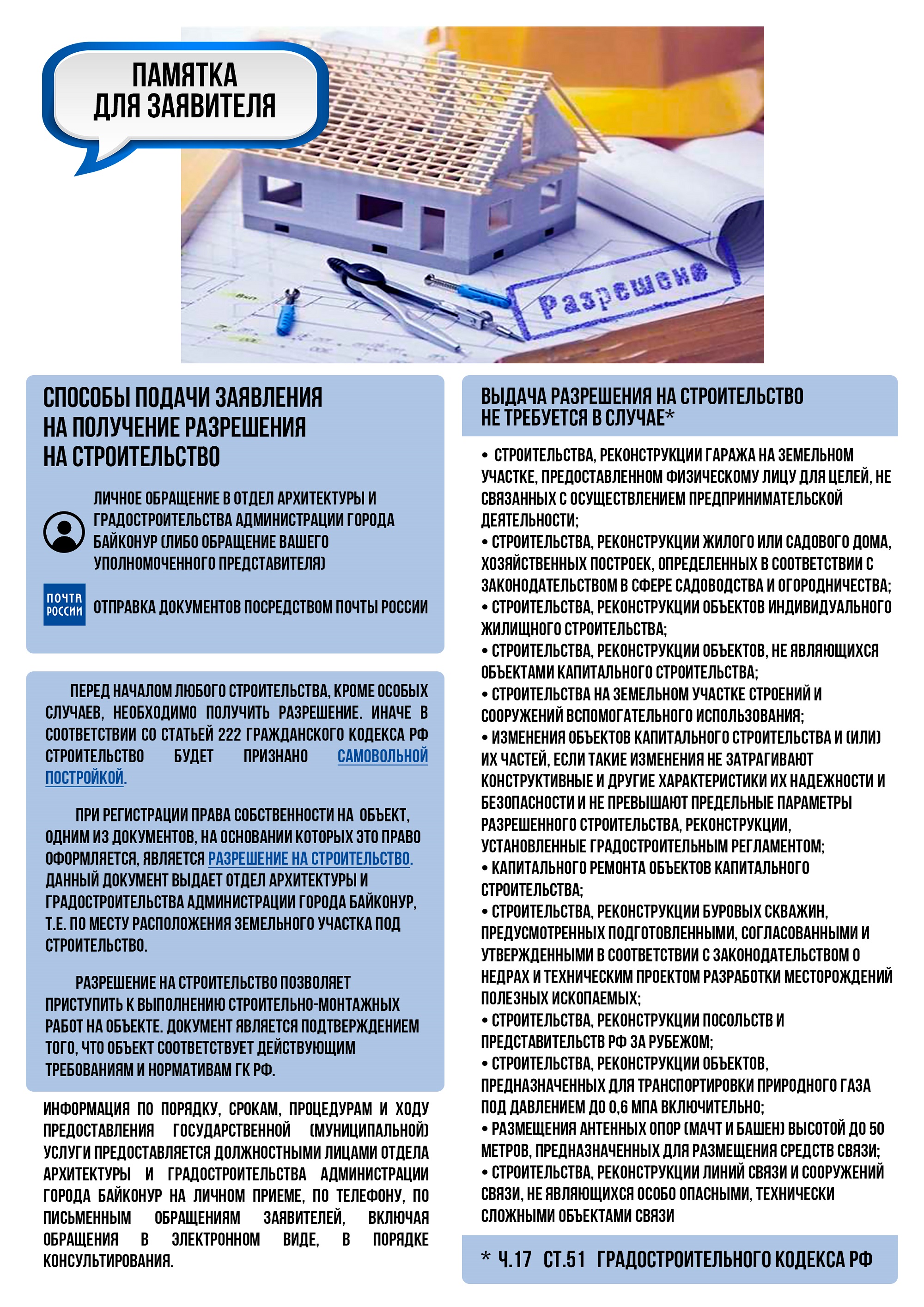 - Постановление Главы администрации города Байконур от 17.04.2018г. №124. «Об утверждении Административного регламента предоставления государственной услуги по подготовке и выдаче разрешений на строительство, реконструкцию объектов капитального строительства, а также на ввод объектов в эксплуатацию на территории города Байконур» (посмотреть)