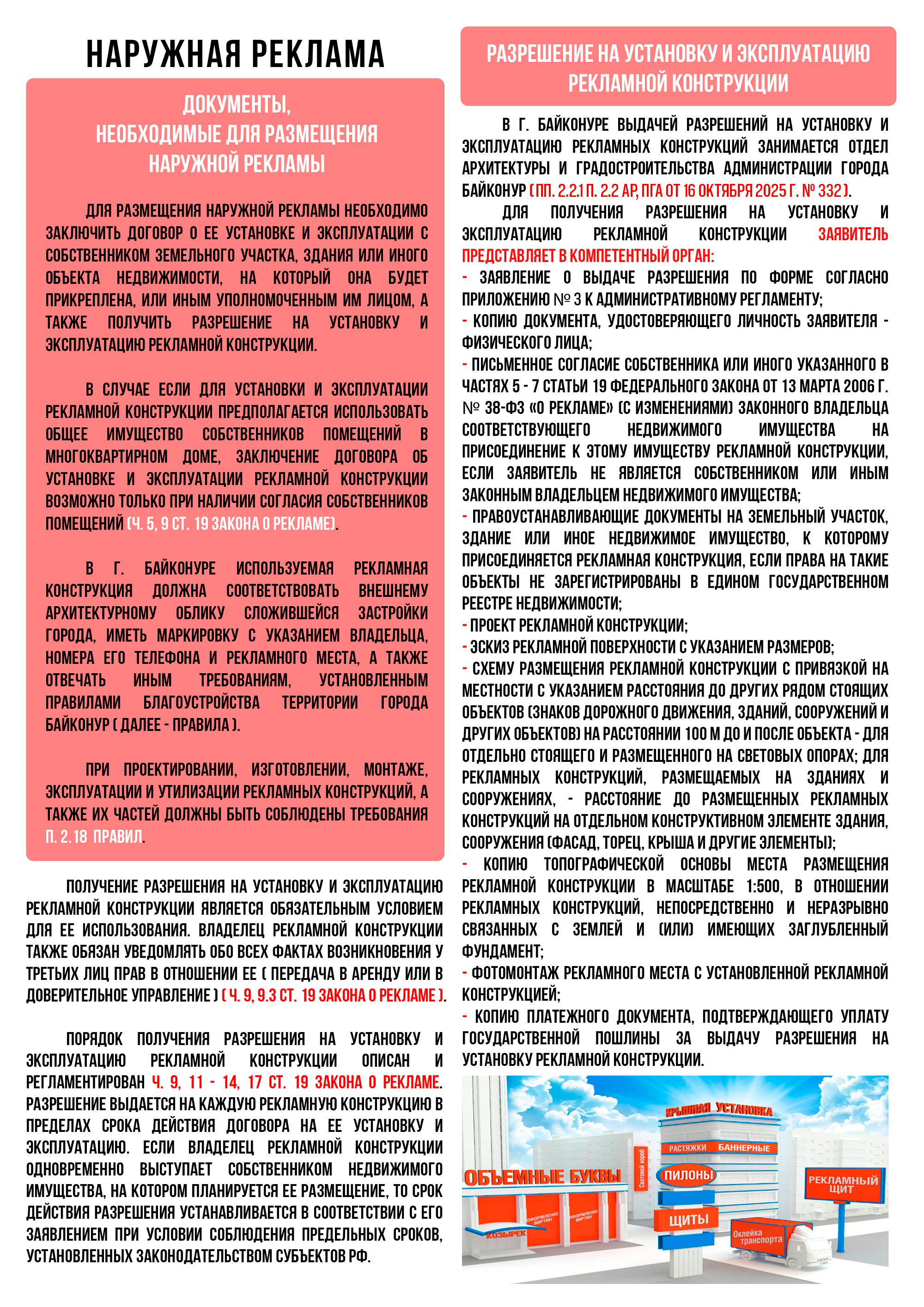 - 4. Постановление Главы администрации города Байконур от 26 января 2011 г. № 07 «Об утверждении Положения о порядке размещения рекламных конструкций на территории города Байконур» (с изменениями). (посмотреть)