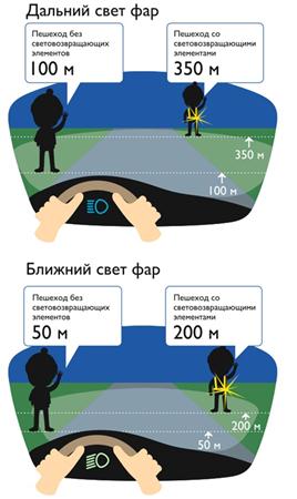 При движении с ближним светом фар водитель автомобиля способен увидеть пешехода на дороге на расстоянии 25-50 метров. Если пешеход применяет световозвращатель, то это расстояние увеличивается до 150-200 метров. А при движении автомобиля с дальним светом фар дистанция, на которой пешеход становится виден, с применением световозвращателей увеличивается со 100 метров до 350 метров. Это даёт водителю 15-25 секунд для принятия решения.