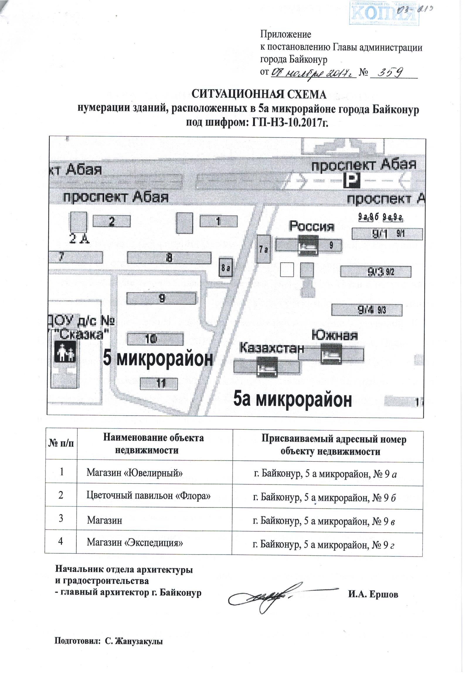 На основании Соглашения между Российской Федерацией и Республикой Казахстан о статусе города Байконур, порядке формирования и статусе его органов исполнительной власти от 23 декабря 1995 г., в связи с отсутствием адресных номеров некоторых объектов недвижимости, расположенных в 5а микрорайоне города Байконур, рассмотрев заявление Сугуровой К.К., Сугурова Т.К. (от 12 октября 2017 г. вх. № 455), в соответствии с Правилами присвоения, изменения и аннулирования адресов на территории города Байконур, утвержденными постановлением Главы администрации города Байконур от 01 февраля 2016 г. № 14 «Об утверждении Правил присвоения, изменения и аннулирования адресов на территории города Байконур»,