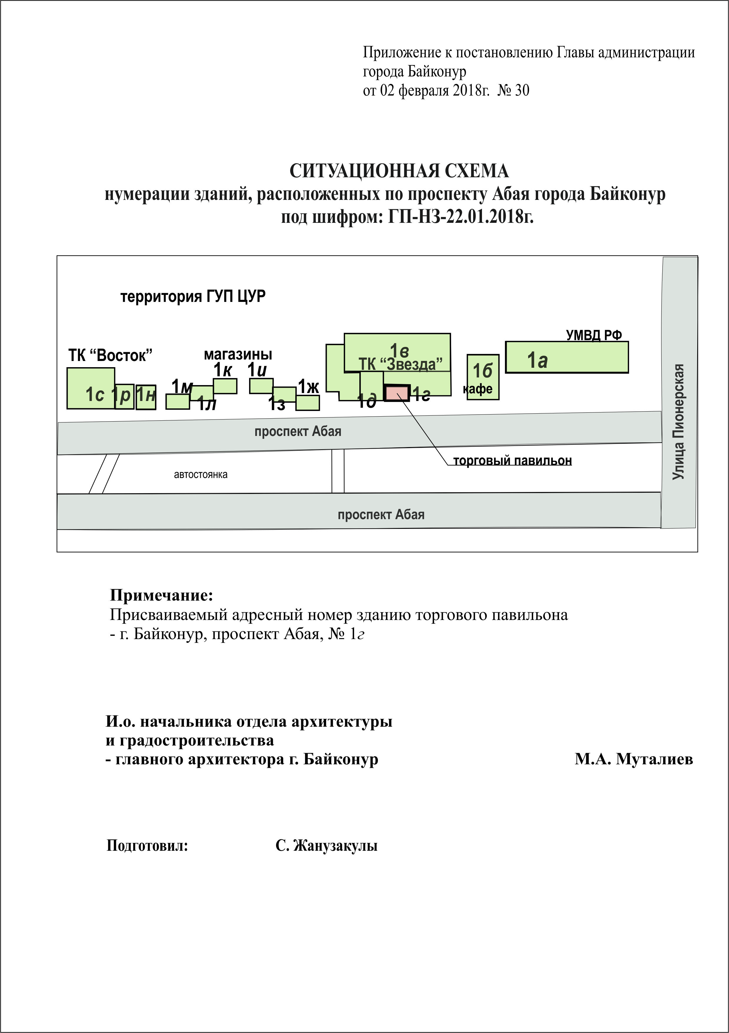 На основании Соглашения между Российской Федерацией и Республикой Казахстан о статусе города Байконур, порядке формирования и статусе его органов исполнительной власти от 23 декабря 1995 г., в связи с отсутствием адресного номера у здания торгового павильона, расположенного по проспекту Абая города Байконур, рассмотрев заявление Насирли Т.Ф. (от 18 января 2018 г. вх. № 15), в соответствии с Правилами присвоения, изменения и аннулирования адресов на территории города Байконур, утвержденными постановлением Главы администрации города Байконур от 01 февраля 2016 г. № 14 «Об утверждении Правил присвоения, изменения и аннулирования адресов на территории города Байконур»,