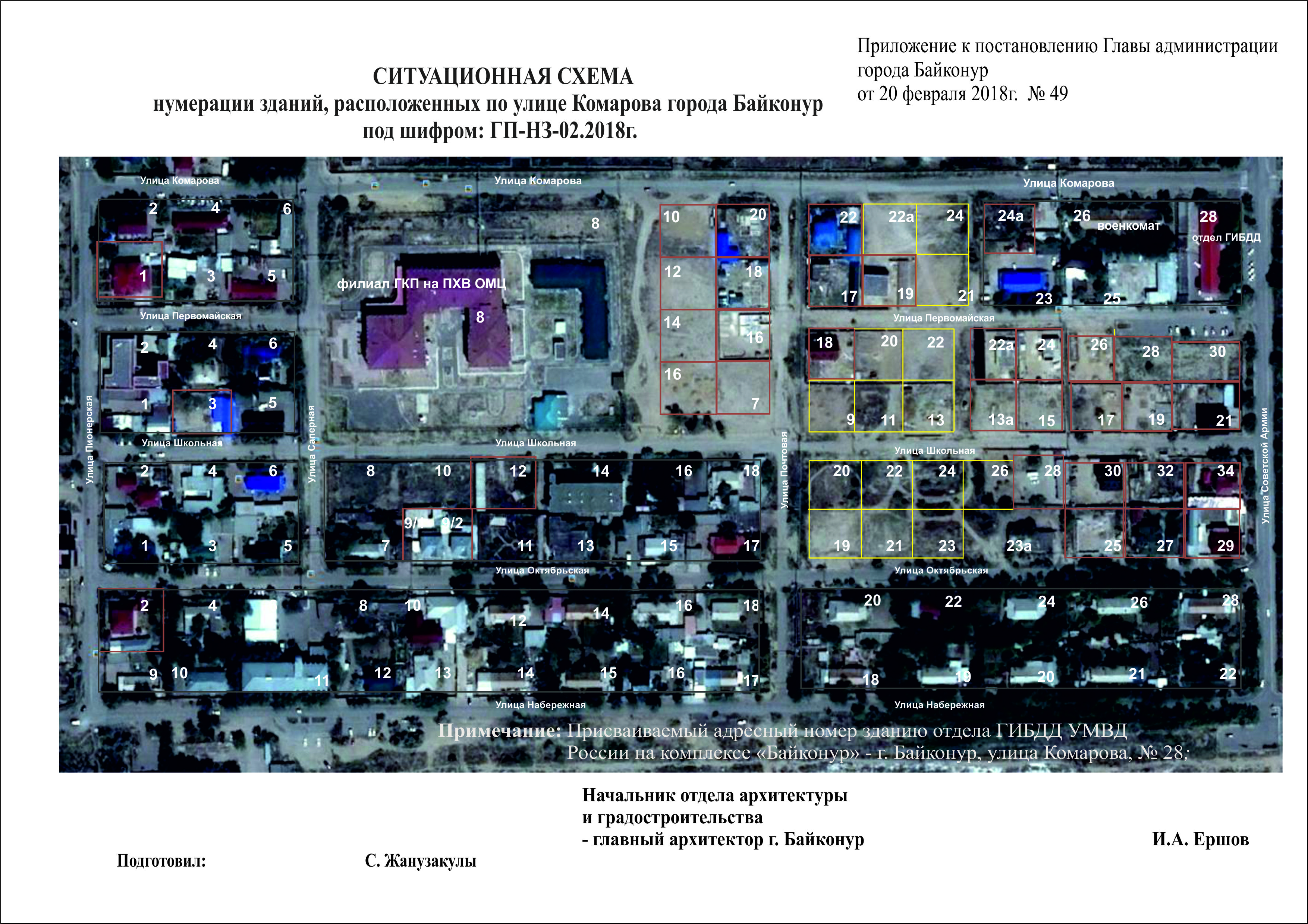 На основании Соглашения между Российской Федерацией и Республикой Казахстан о статусе города Байконур, порядке формирования и статусе его органов исполнительной власти от 23 декабря 1995 г., в связи с отсутствием адресного номера у здания отдела государственной инспекции безопасности дорожного движения Управления Министерства внутренних дел России на комплексе «Байконур» (далее - отдел ГИБДД УМВД России на комплексе «Байконур»), расположенного по улице Комарова города Байконур, рассмотрев заявление начальника УМВД России на комплексе «Байконур» А.И. Желудкова (от 01 февраля 2018 г. вх. № 41), в соответствии с Правилами присвоения, изменения и аннулирования адресов на территории города Байконур, утвержденными постановлением Главы администрации города Байконур от 01 февраля 2016 г. № 14 «Об утверждении Правил присвоения, изменения и аннулирования адресов на территории города Байконур»,