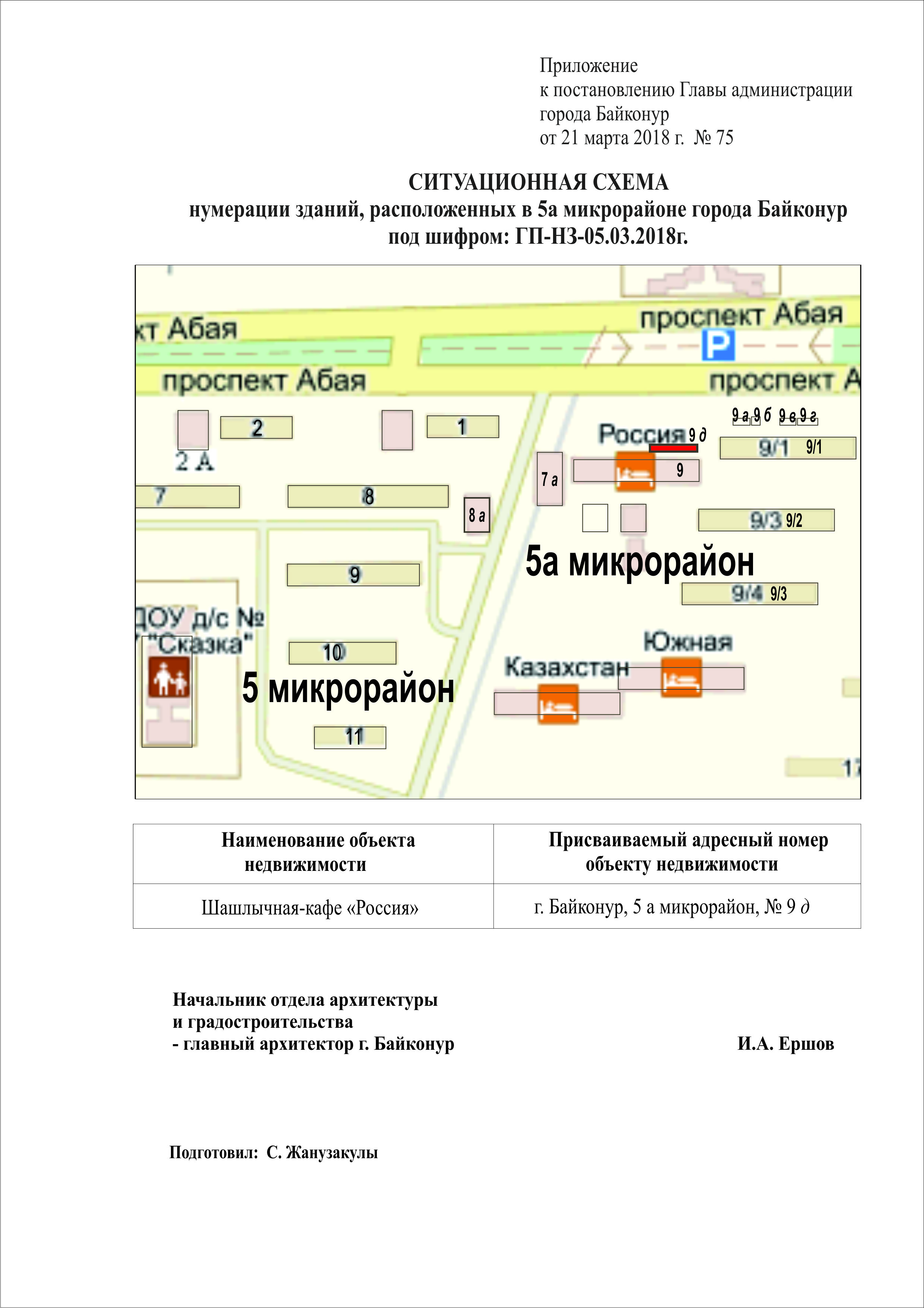 1. Присвоить адресный номер зданию шашлычной - кафе «Россия» согласно прилагаемой к настоящему постановлению ситуационной схеме нумерации зданий, расположенных в 5а микрорайоне города Байконур под шифром ГП - НЗ - 05.03.2018г.: город Байконур, 5а микрорайон, № 9д.